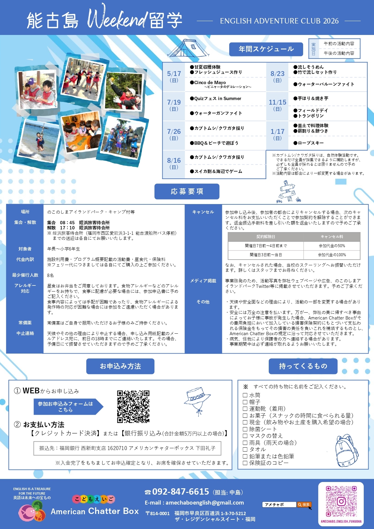 2026年度「能古島 Weekend留学」開催のお知らせです。